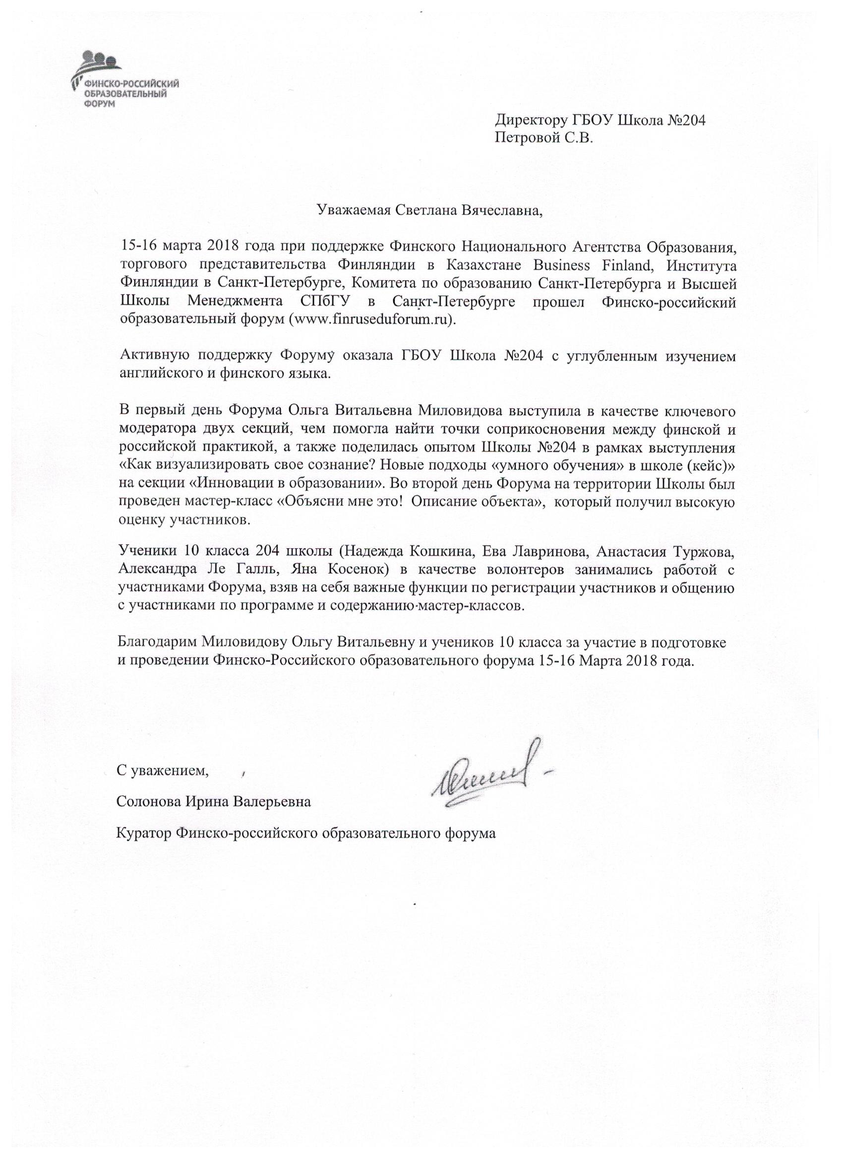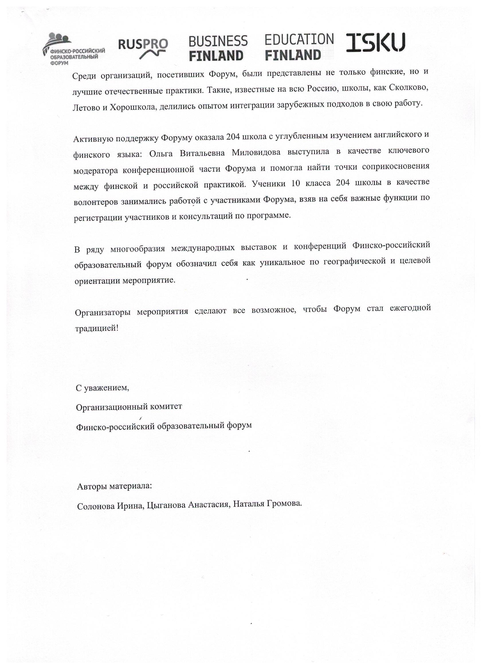 Активную поддержку Форуму оказала ГБОУ Школа №204 с углубленным изучением иностранных языков (английского и финского) Центрального района.