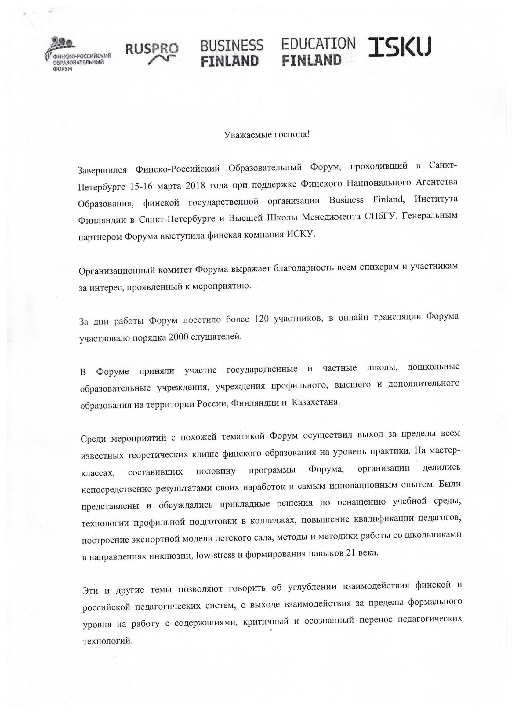 15-16 марта 2018 года при поддержке Финского Национального Агентства Образования, торгового представительства Финляндии в Казахстане BusinessFinland, Института Финляндии в Санкт-Петербурге, Комитета по образованию Санкт-Петербурга и Высшей Школы Менеджмента СПбГУ в Санкт-Петербурге прошел Финско-российский образовательный форум (www.finruseduforum.ru).