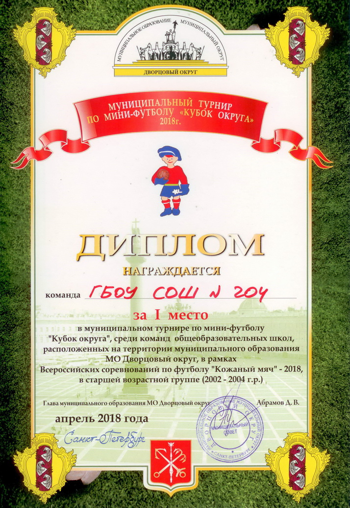 С 18 по 20 апреля 2018 года в спортивном зале ГБОУ СОШ №222 «Петришуле» в трёх возрастных группах: младшей (2006 г.р. и младше), средней (2004-2005 г.р.) и старшей (2001-2003 г.р.) состоялся муниципальный турнир по мини-футболу «Кубок Округа», среди команд общеобразовательных школ, расположенных на территории МО Дворцовый округ.