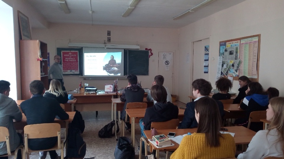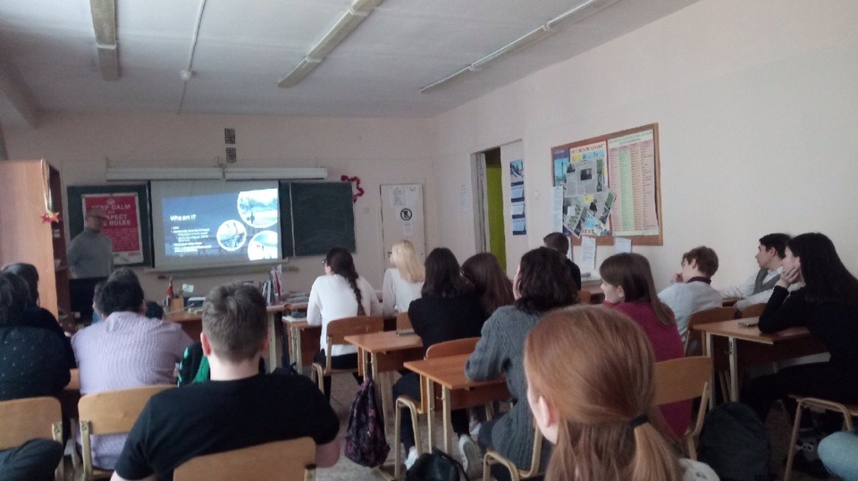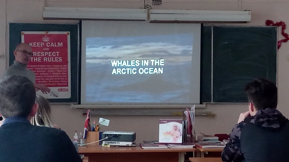 Для встречи со старшими школьниками Алексис выбрал тему «Киты в Арктике». Беседа проходила интерактивно: вопрос-ответ-пояснение.Даже учителя, присутствовавшие на уроках, сделали очень много открытий.Самый повторяющийся вопрос, который задавали ученики в конце уроков, был таким:«Have you ever seen a whale?» К сожалению, Алексис не видел кита своими глазами, но его презентация и рассказ были такими убедительными, что все решили, что перед нами специалист-биолог.