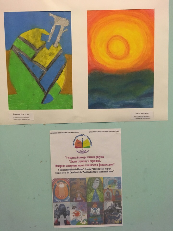 12 февраля в центральной библиотеке города Ювяскюля, (Финляндия) в преддверии празднования 170летия со дня второго издания финского эпоса "Калевала", открылась выставка работ победителей V открытого конкурса детского изобразительного творчества "Листая страницу за страницей. Мифы о сотворении мира в славянском и финском эпосе". Конкурс проводился в 2018 году детской школой искусств "Канцона" города Ярославля в рамках международного проекта "Школьный двор - Перекресток культур".