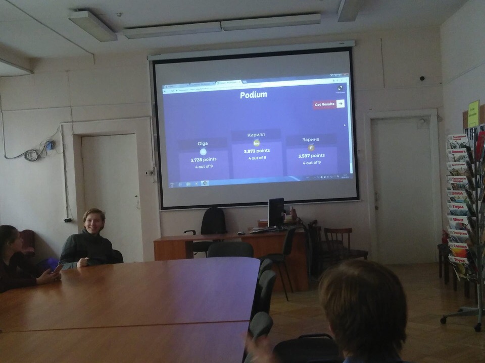 А чуть позднее стажёр Школы, студентка из гимназии Лауттасаари Хельсинки Туули Лённберг подготовила и провела для учащихся 7 класса викторину о Финляндии с помощью мобильного приложения Kahoot! Новые технологии все настойчивее проникают в современную школу! 10 вопросов, на каждый из которых надо успеть ответить за 1 минуту. Напряжение и интерес возникают уже с первых секунд! Ребята радуются, когда отвечают верно. Огорчаются неверным ответам.