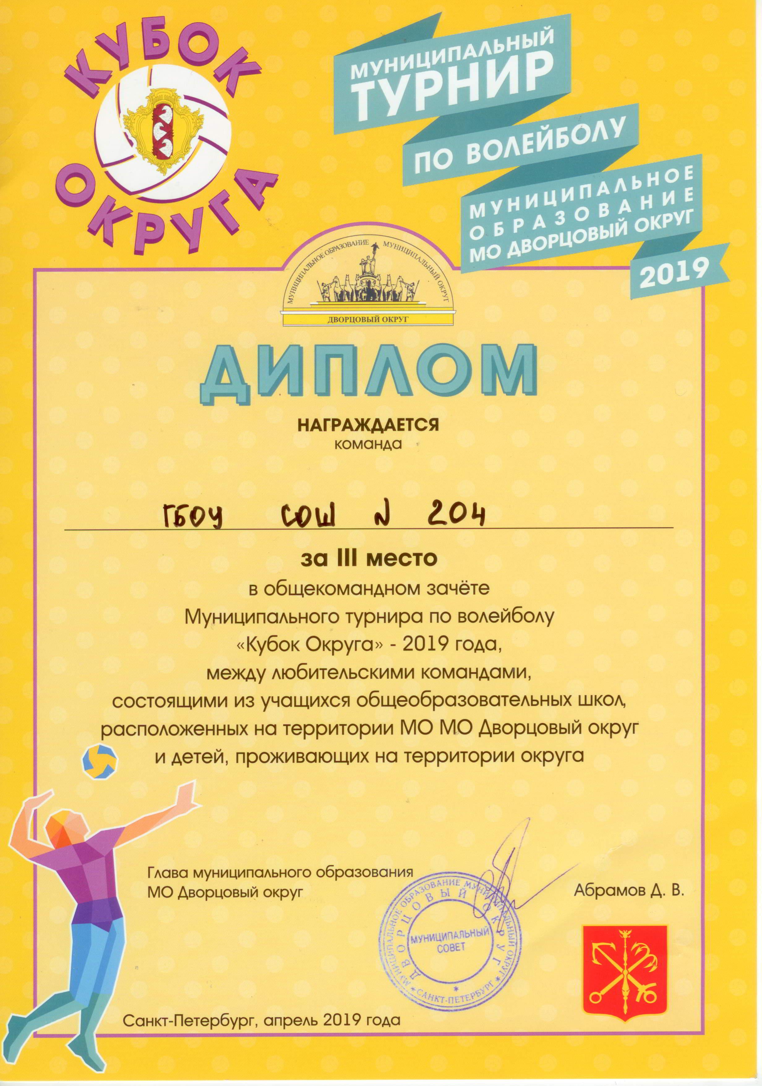 С 22 по 23 апреля 2019 года на территории муниципального образования в спортивном зале ГБОУ СОШ № 222 «Петришуле» (Невский пр., д. 22-24) состоялся муниципальный турнир по волейболу «Кубок Округа» - 2019 года, между любительскими командами, состоящими из учащихся общеобразовательных школ, расположенных на территории МО МО Дворцовый округ и детей, проживающих на территории округа, в двух возрастных группах: младшей (2006-2007 г.р.) и старшей (2001-2004 г.р.).