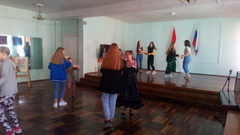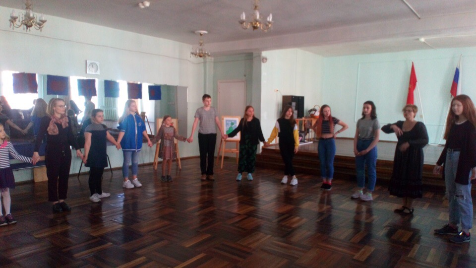 Затем в Зеркальном зале все танцевали и учились доверять друг другу, произносить русские слова и трудные звуки!