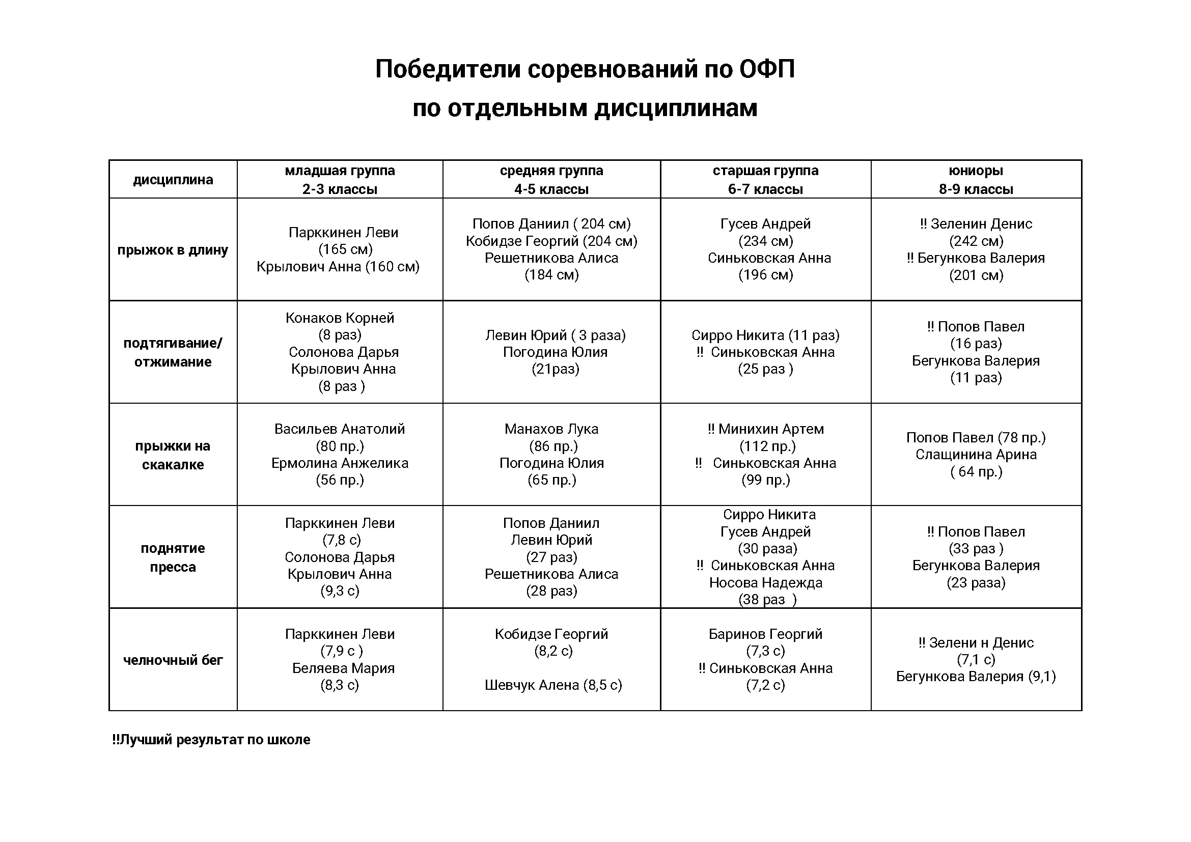 В мае в школе прошли итоговые спортивные соревнования по ОФП, в которых приняло участие 94 учащихся 2-9 классов. Это четвертые соревнования в этом учебном году. В личном спортивном дневнике занесены все предыдущие результаты. Ребята могут увидеть динамику своих спортивных достижений.