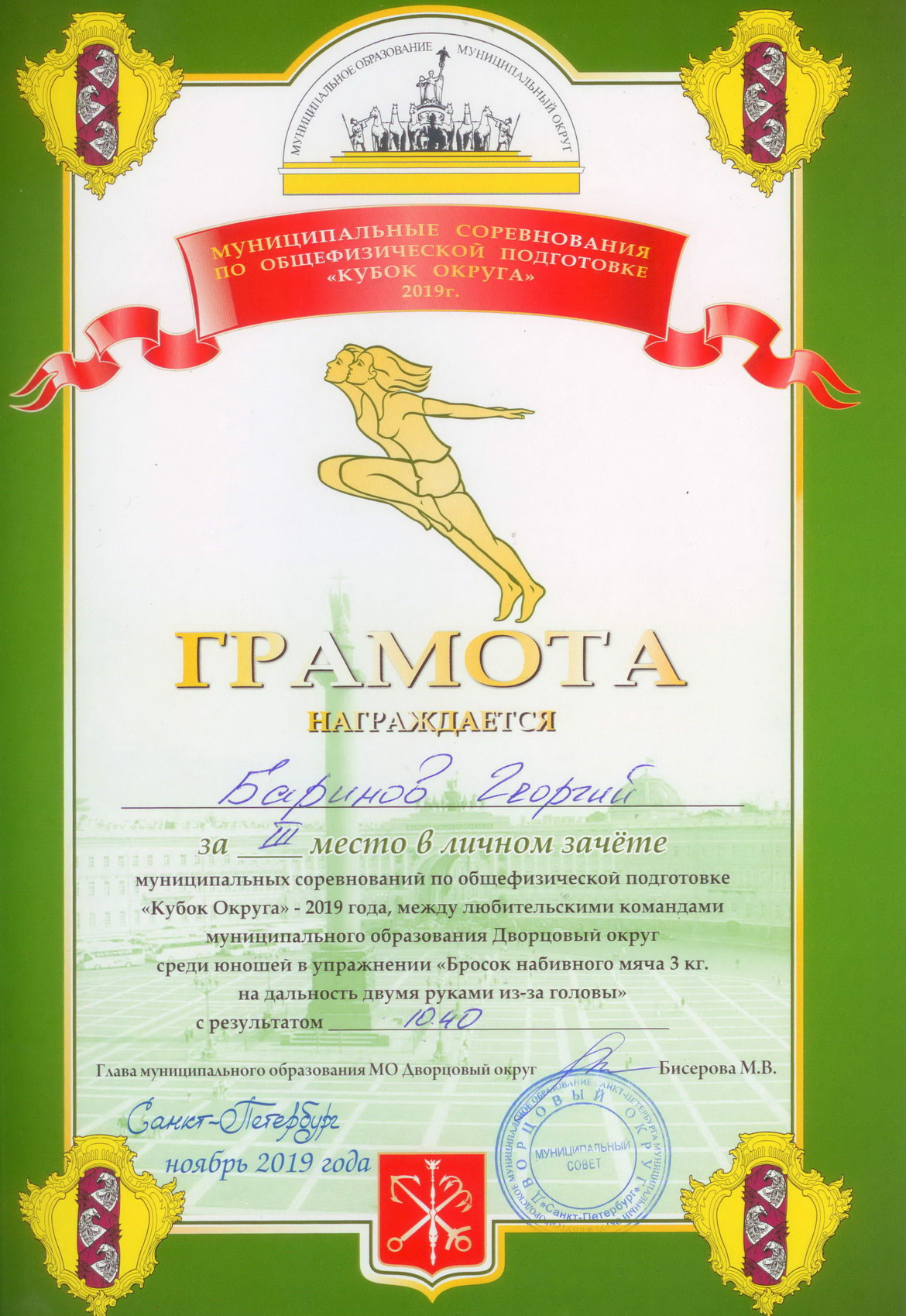 3 место в упражнении «Бросок мяча 3 кг на дальность» – Баринов Георгий (8 кл)