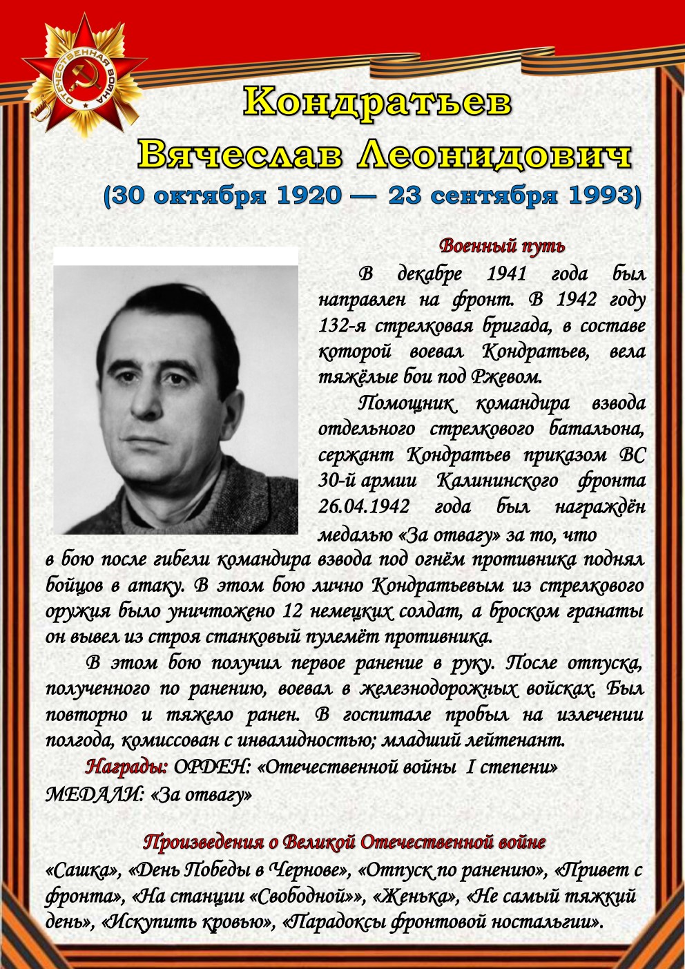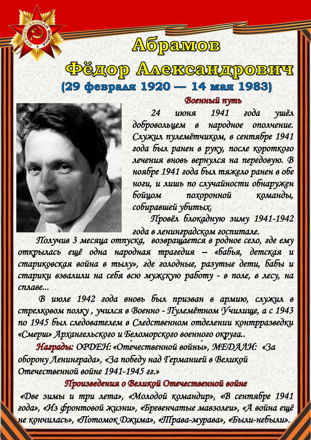 75 лет отделяют нас от начала Великой Отечественной войны (1941-1945). Но время не снижает интереса к этой теме, обращая внимание сегодняшнего поколения к далёким фронтовым годам, к истокам подвига и мужества советского солдата - героя, освободителя, гуманиста. Да, слово писателя на войне и о войне трудно переоценить.