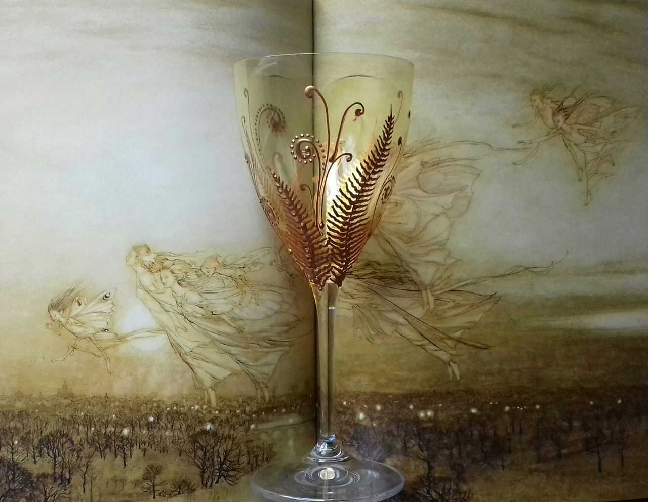 Весенней выставке не суждено было осуществиться в задуманном формате, но у нас есть возможность показать вам некоторые ее фрагменты. На фотографиях бокалы и кубки, выполненные в технике витражной росписи, а фоном им служат иллюстрации Брайана Фрауда, Чарльза Весса, Артура Рэкхэма и других художников.