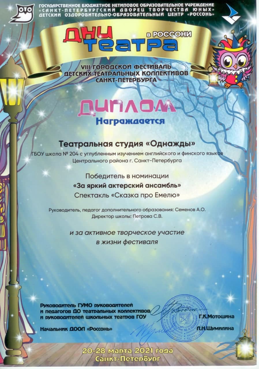 В дни школьных каникул наша театральная студия «Однажды» принимала участие в городском фестивале детских театральных коллективов «Дни театра в Россони». По традиции фестиваль проходил на базе ДООЛ «Россонь», где ребята из разных театральных коллективов Санкт-Петербурга не только участвовали в театральном марафоне, посещали мастер-классы, но и имели возможность пообщаться, отдохнуть, набраться сил перед последней четвертью.
