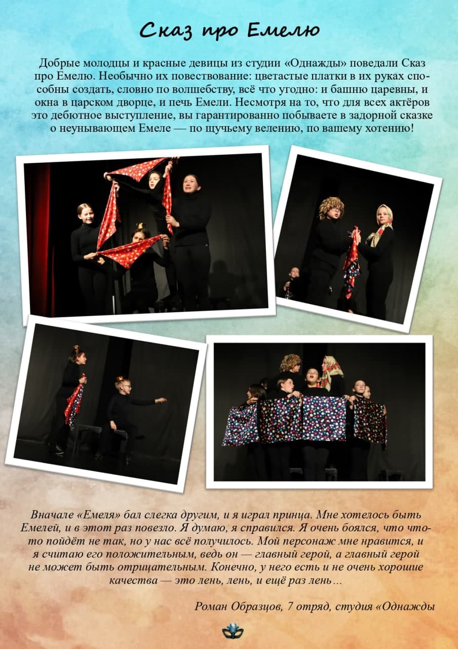 Наши ребята привезли на фестиваль спектакль по мотивам русской народной сказки «Сказка про Емелю». В спектакле нет декораций и ярких костюмов: в руках юных артистов только цветастые платки, из которых, словно по волшебству, создаются сани, русская печь, башня царевны и даже ведра. Весь спектакль сопровождает интересно подобранная музыка. Внимание зрителя притягивают движения артистов, перестроения на сцене, актерское мастерство. Спектакль смотрится на одном дыхании.