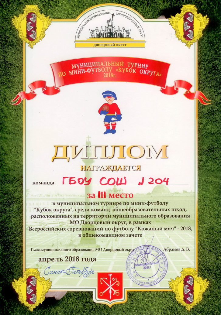 С 18 по 20 апреля 2018 года в спортивном зале ГБОУ СОШ №222 «Петришуле» в трёх возрастных группах: младшей (2006 г.р. и младше), средней (2004-2005 г.р.) и старшей (2001-2003 г.р.) состоялся муниципальный турнир по мини-футболу «Кубок Округа», среди команд общеобразовательных школ, расположенных на территории МО Дворцовый округ.