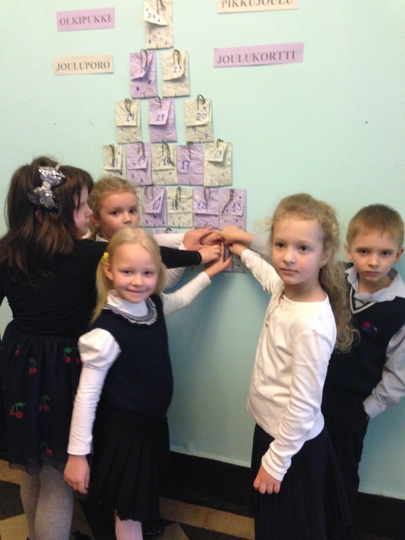 Прежде всего потому, что 6 декабря отмечается День независимости. А ещё потому, что весь месяц в Финляндии готовятся к Рождеству, joulu, самому главному празднику года. 1 декабря мы открыли рождественский календарь, adventtikalenteri, 15 декабря ели рождественскую кашу, joulupuuro, а вчера мы устроили самые настоящие рождественские песнопения, kauneimmat joululaulut. Вся начальная школа, а такое 5-6 классы, то есть по-Финской системе это и есть начальная школа, собирались на каждой переменке и пели песни.
