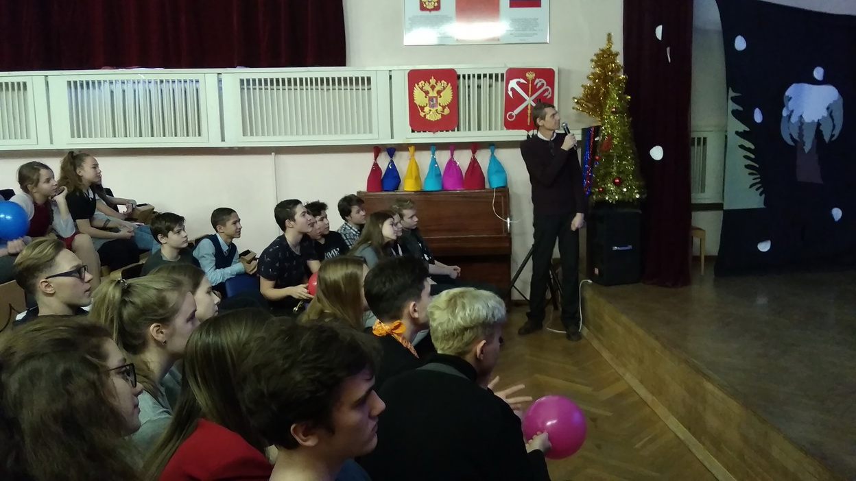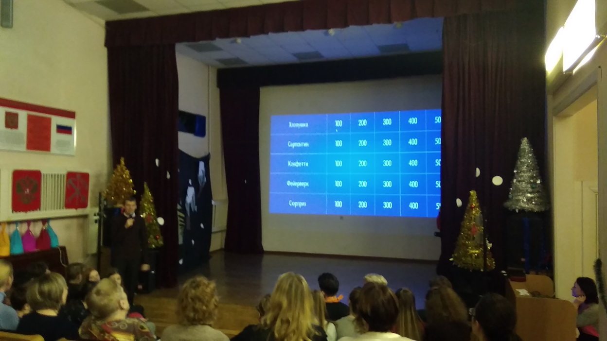 28 декабря, в последний день 2 четверти, прошла веселая новогодняя викторина «Своя игра», в которой приняли участие 3 команды: команда 11 класса, сборная команда 8-9 классов и команда педагогов. Отвечая на вопросы, участники вспомнили о традициях празднования Нового года в разных странах, о новогодних фильмах, зимних сказках, песнях и загадках.
