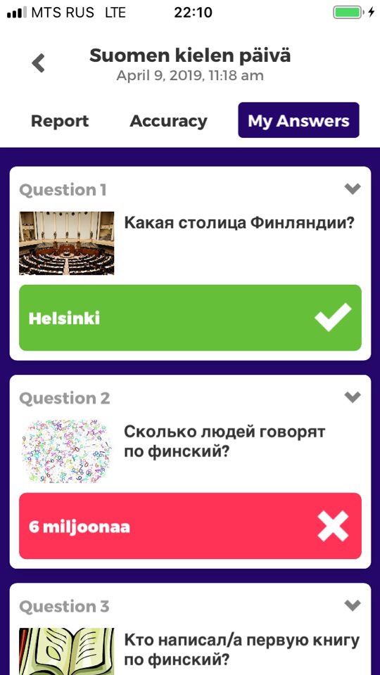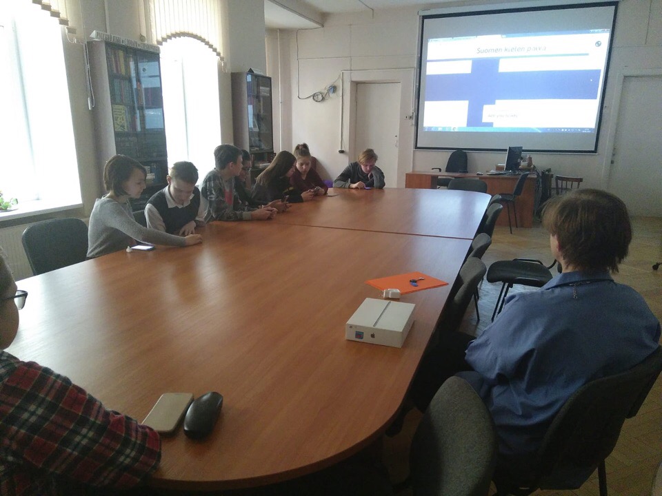 А чуть позднее стажёр Школы, студентка из гимназии Лауттасаари Хельсинки Туули Лённберг подготовила и провела для учащихся 7 класса викторину о Финляндии с помощью мобильного приложения Kahoot! Новые технологии все настойчивее проникают в современную школу! 10 вопросов, на каждый из которых надо успеть ответить за 1 минуту. Напряжение и интерес возникают уже с первых секунд! Ребята радуются, когда отвечают верно. Огорчаются неверным ответам.