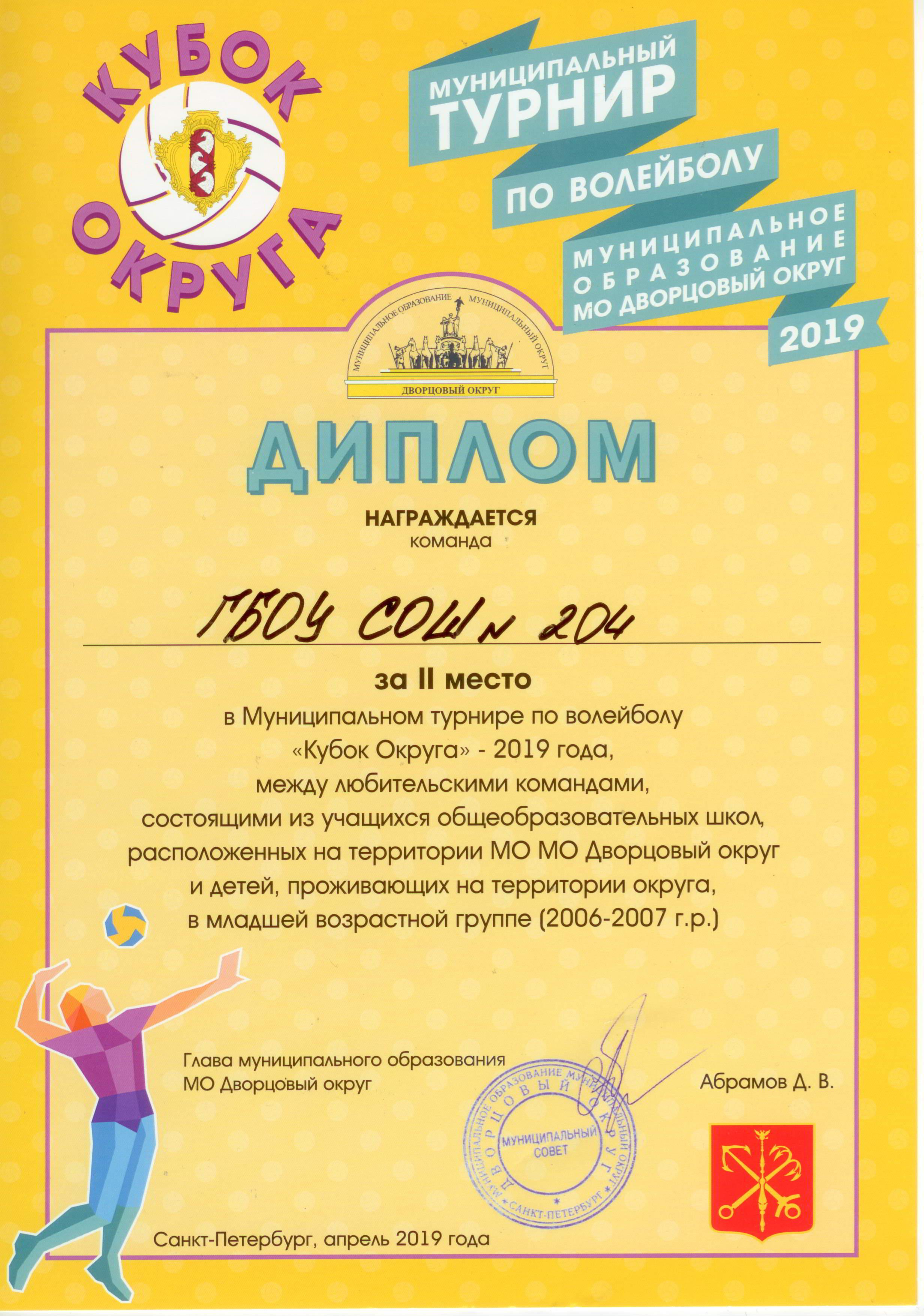 С 22 по 23 апреля 2019 года на территории муниципального образования в спортивном зале ГБОУ СОШ № 222 «Петришуле» (Невский пр., д. 22-24) состоялся муниципальный турнир по волейболу «Кубок Округа» - 2019 года, между любительскими командами, состоящими из учащихся общеобразовательных школ, расположенных на территории МО МО Дворцовый округ и детей, проживающих на территории округа, в двух возрастных группах: младшей (2006-2007 г.р.) и старшей (2001-2004 г.р.).