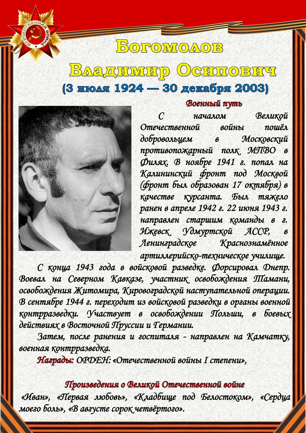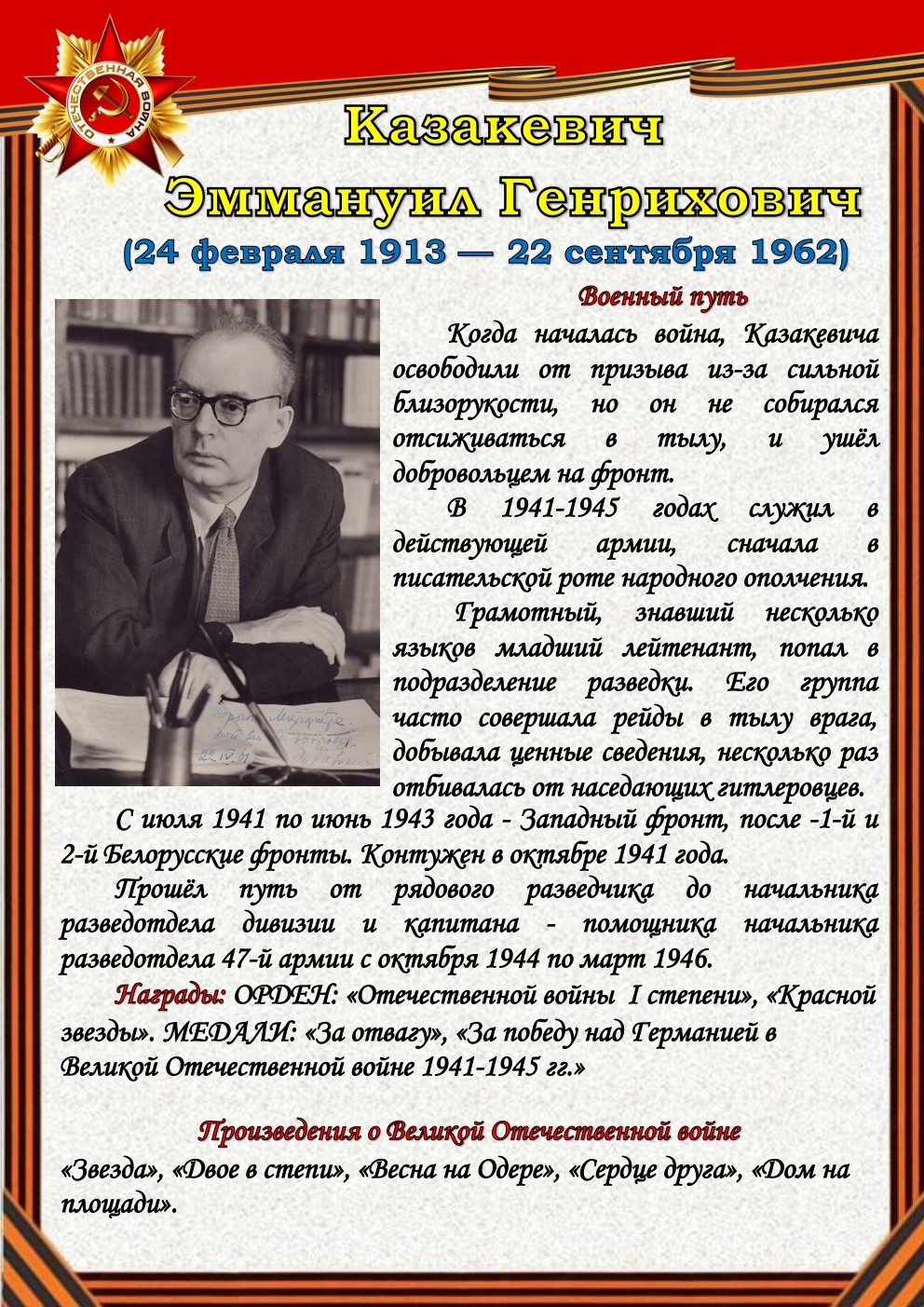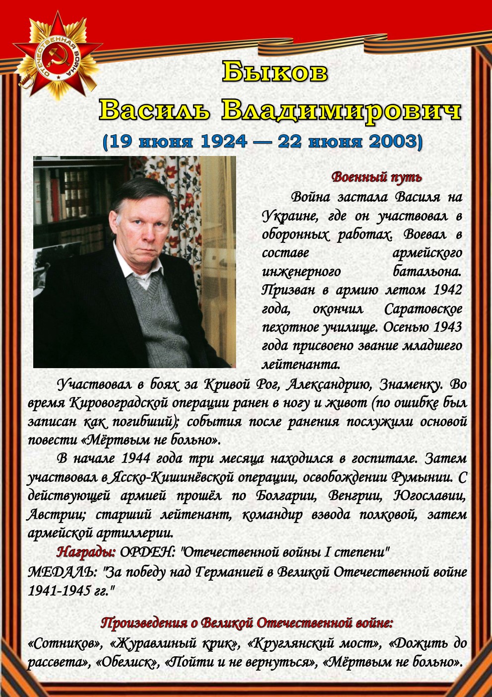 75 лет отделяют нас от начала Великой Отечественной войны (1941-1945). Но время не снижает интереса к этой теме, обращая внимание сегодняшнего поколения к далёким фронтовым годам, к истокам подвига и мужества советского солдата - героя, освободителя, гуманиста. Да, слово писателя на войне и о войне трудно переоценить.